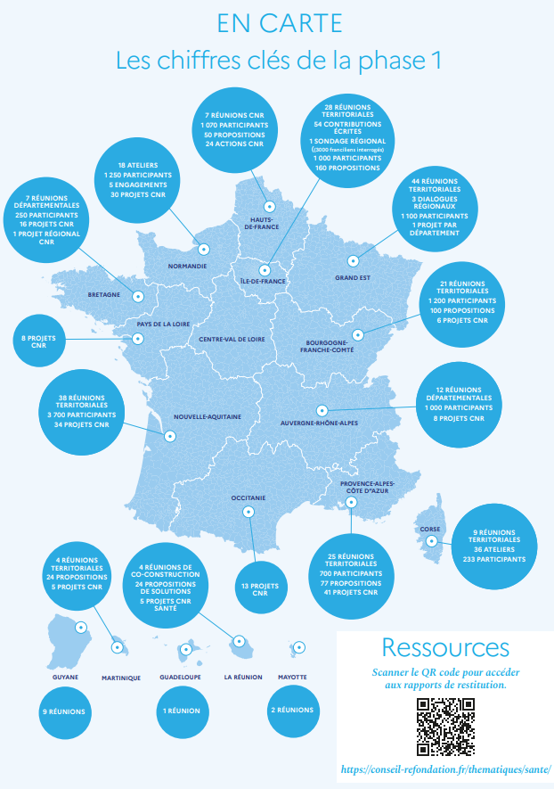 Une démarche de dialogue inédite entre les partiesprenantes de chaque territoire. L’Acte I du CNR Santé a donné lieu à l’organisation de plus de 250 réunions sur tout le territoire, réunissant environ 10 000 participants : élus, citoyens, usagers, professionnels hospitaliers et libéraux, associations, etc. Sur la base de ce premier dialogue engagé, la démarche du CNR Santé s’ancre et se poursuit depuis dans chaque territoire pour constituer le socle territorial de la politique de santé, dans une dynamique de concertation et d’accélération de solutions concrètes sur le terrain.